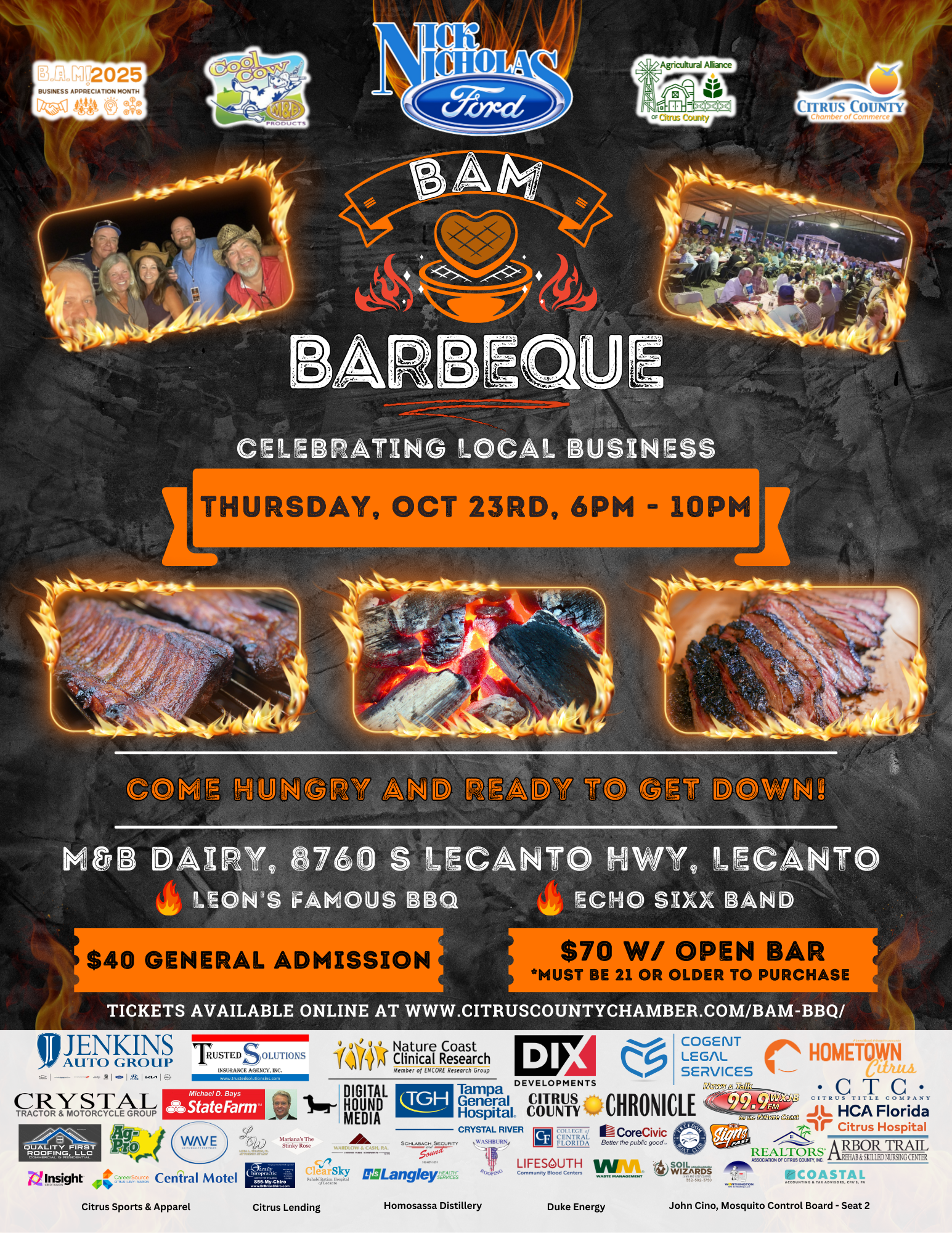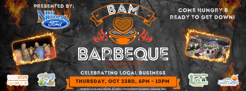 Kick off the celebration of Citrus County businesses at the B.A.M. BBQ, where gratitude meets great food, fantastic music, and unforgettable networking! This isn’t just a BBQ, it’s our way of saying thank you to the businesses driving growth, innovation, and community spirit in Citrus County.