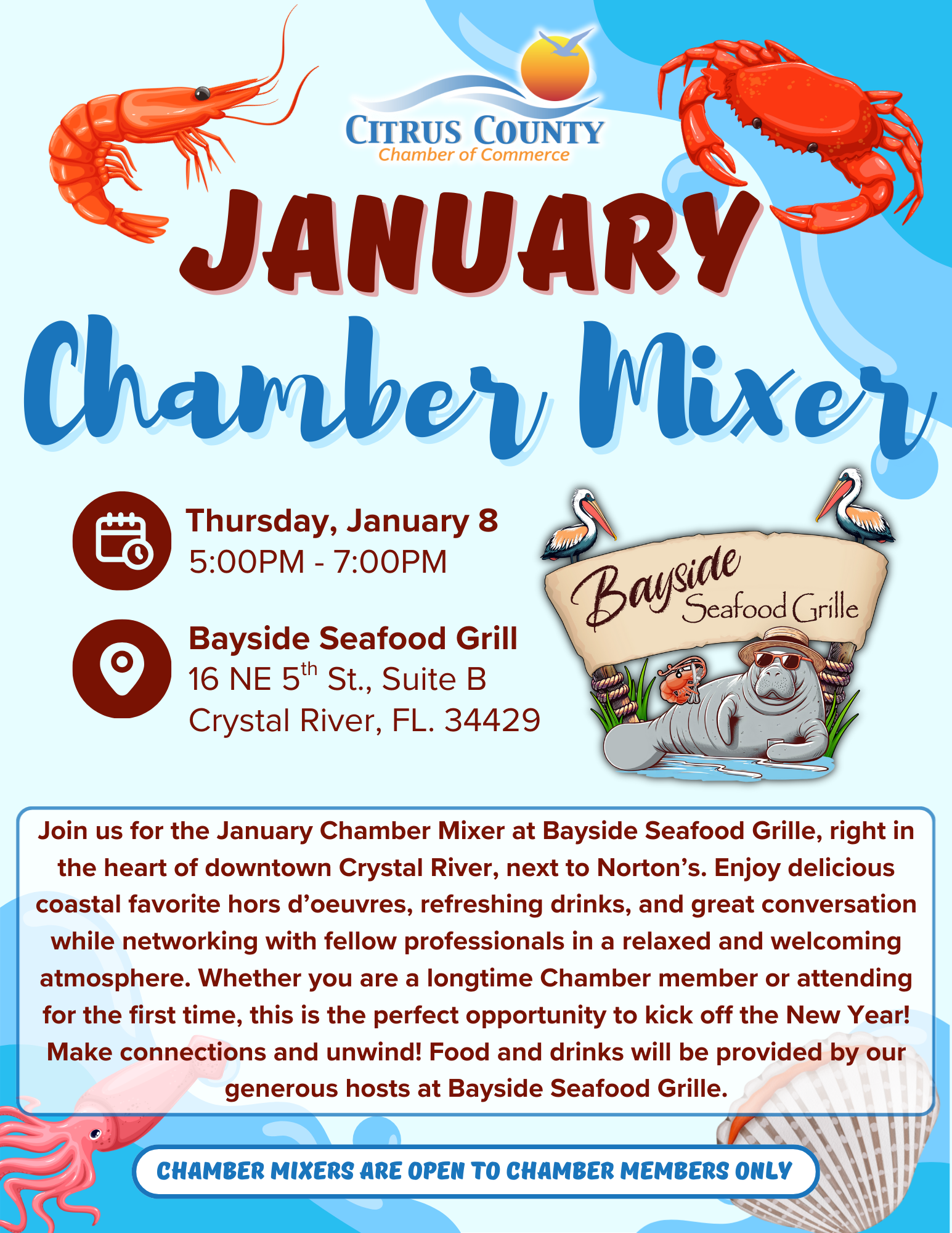 Join us for the January Chamber Mixer at Bayside Seafood Grille, right in the heart of downtown Crystal River, next to Norton's. Enjoy delicious coastal favorite hors d’oeuvres, refreshing drinks, and great conversation while networking with fellow professionals in a relaxed and welcoming atmosphere. Whether you are a longtime Chamber member or attending for the first time, this is the perfect opportunity to kick off the New Year! Make connections and unwind! Food and drinks will be provided by our generous hosts at Bayside Seafood Grille.