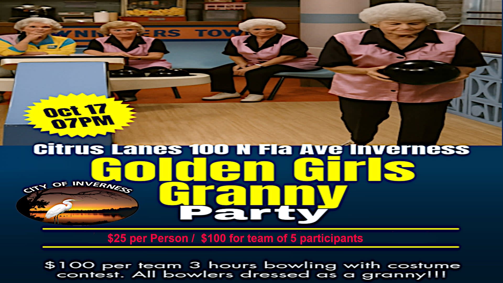 Come dressed in your Granny Best. Grab your housecoat, comfy shoes, and Wide Frame glasses and come have a ball with us!!! This event is part of the City of Inverness Cootertober Celebrations. Men, Women and children come dressed as the Golden Girls for an awesome evening of bowling.