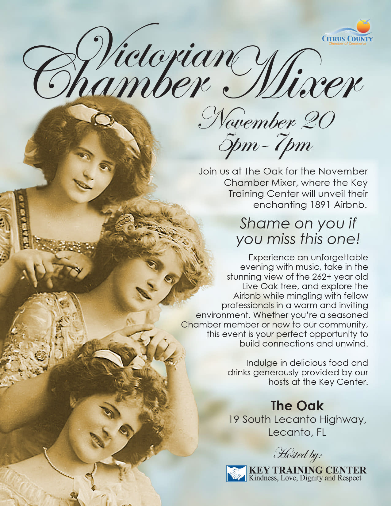 Join us on Thursday, November 20th from 5 PM to 7 PM for an unforgettable evening, held alongside the sprawling branches of a 262+ year-old Live Oak tree at The Oak, home to The Key Training Center’s newly unveiled Victorian-style 1891 Airbnb! Stroll the wraparound porch, take in the view, and sip as the sun sets on a beautiful piece of Citrus County history.